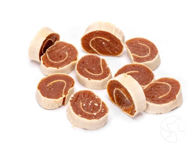 A fehér és barna színű, tekercs formájú jutalomfalatok minden kutyát elcsábítanak finom ízükkel, miközben segítenek a száj egészségének megőrzésében.