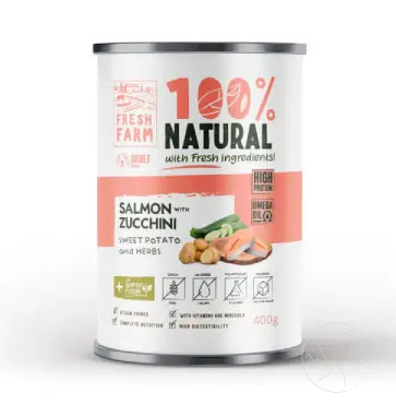 Vitaminokkal és ásványi anyagokkal dúsított, teljes értékű és kiegyensúlyozott pástétom húsdarabokkal lazacból, cukkinivel, édesburgonyával és gyógynövényekkel. Ideális kutyája mindennapi etetésre. Teljes értékű nedves állateledel felnőtt kutyák számára. ÖSSZETÉTEL: 25% hal, 25% lazac, 5% halbőr, 6% cukkini, 3% édesburgonya, 2% sárgarépa, 2% bogyós gyümölcsök, vitaminok és ásványi anyagok, fűszernövény keverék, lazacolaj, petrezselyem, lenmag, alga. ADALÉKANYAGOK/kg: D3-vitamin (E671) 200 NE, Vit. E (3a370) 150 mg, cink (3b610) 15 mg, mangán (3b510) 3 mg, kalcium-karbonát 2 mg. ANALITIKAI ÖSSZETEVŐK: nyersfehérje 8,5%, zsírtartalom 4%, nyershamu 2%, nedvesség 75,0%, nyersrost 0,8%, kalcium 0,3%, foszfor 0,2%, nátrium 0,4%. Adagolási útmutató: Ideális kiegészítő a száraz eledelhez is. Segíti a tápanyagfelvételt és folyadékbevitelt. Az egynapi adag aktivitástól és környezettől függően változó. A változatosság növelése és az étvágy fokozása céljából történő etetés esetén, ne feledje csökkenteni kutyája ajánlott napi rendszeres adagját. Szobahőmérsékleten etesse. Biztosítson kutyájának hozzáférést friss ivóvízhez. Száraz hűvös helyen tárolja. A doboz kinyitása után tartsa a hűtőszekrényben, felbontás után 48 órán belül kerüljön felhasználásra.