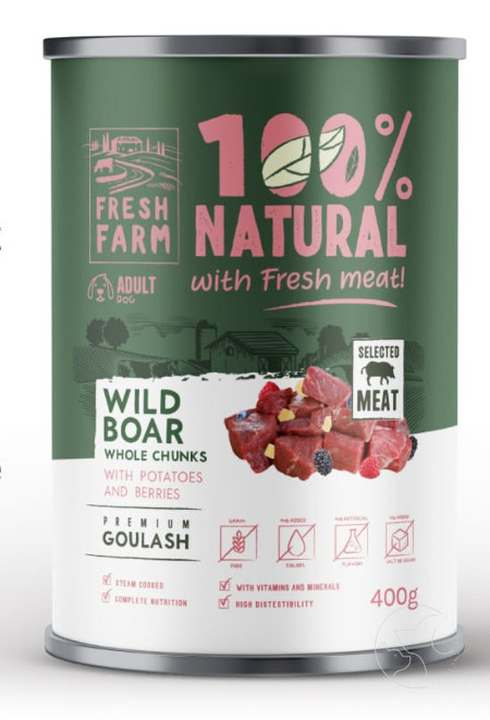 ÖSSZETÉTEL: 80% vaddisznóhús, 6% burgonya, 2% bogyós gyümölcsök, 1% fűszerkeverék, 0,5% lazacolaj. ADALÉKANYAGOK/kg: D3-vitamin (E671) 200 NE, E-vitamin (3a370) 150 mg, cink (3b610) 15 mg, mangán (3b510) 3 mg, kalcium-karbonát 2 mg. ANALITIKAI ÖSSZETEVŐK: nyersfehérje 11%, nyerszsír 5%, nyersrost 1%, nyershamu 2%, nedvességtartalom 75,0%, ásványi anyagok és vitaminok