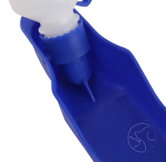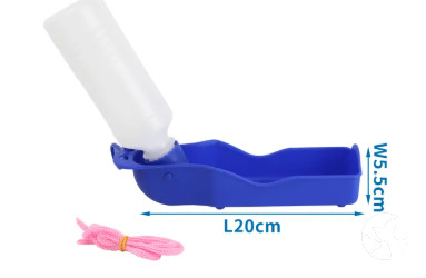 Kék, hordozható kutyás vizespalack – 250 ml, műanyag palack, kampóval és kötéllal. 20×5,5 cm átmérőjű, nettó tömege 66 g. Beltérre és kültérre is alkalmas.