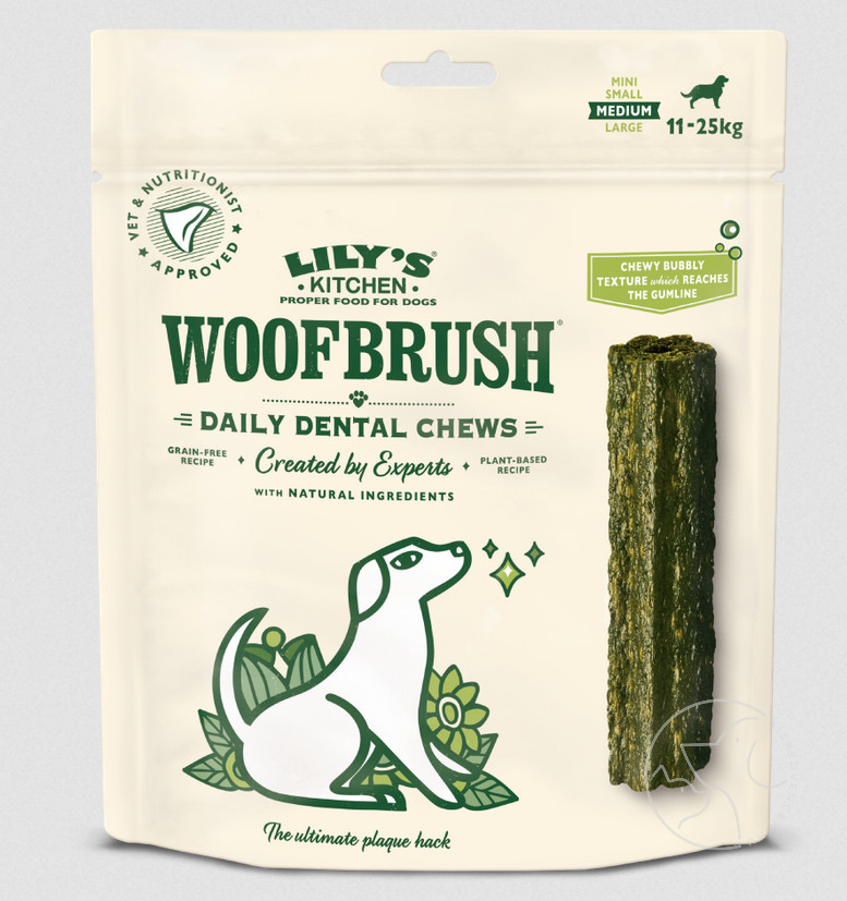 A Woofbrush-t Lily's Kitchen kisállatfogászati ​​szakértőinek segítségével gondosan fejlesztették ki, hogy garantáltan kiválóan működjön, és első osztályú természetes összetevőket, például petrezselymet, kókuszolajat és édesköményt tartalmaz a megfelelő tisztítás érdekében, adalékanyagok nélkül. Ráadásul a kutyák imádják az ízét. A Woofbrush egy olyan rágóka, ami inkább jutalom, mint teher. Naponta egy Woofbrush-t javaslunk kutyája fogászati ​​egészségének támogatására, és ez a 7 fográgót tartalmazó csomag tökéletes a nagyobb kutyák (26 kg felett) számára, hogy a hét minden napján adjanak egyet.