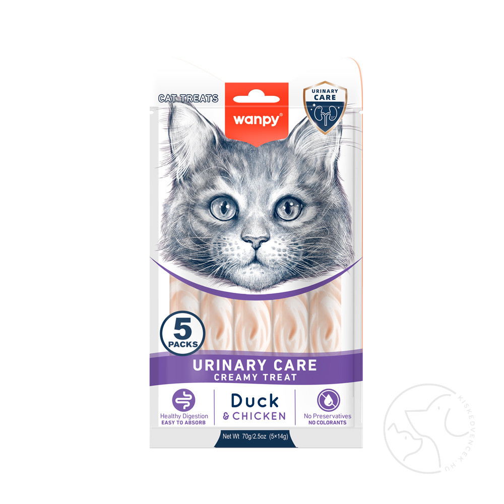 A Wanpy Functional Creamy Lickable Treat Urinary Care egy finom folyékony jutalomfalat, amelyet 3 hónapos kortól fejlesztettek ki a macskák és kiscicák húgyúti egészségének támogatására. Kiváló minőségű kacsából és csirkéből készült, esszenciális fehérjéket biztosít, miközben kíméletes az emésztőrendszerhez. Mesterséges színezékektől és tartósítószerektől mentes, ez a jutalomfalat biztonságos és egészséges kiegészítője kedvence étrendjének.