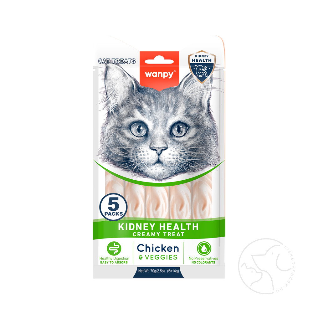 Wanpy felnőtt macskáknak szánt krémes, nyalogató jutalomfalat vesebetegségben szenvedőknek