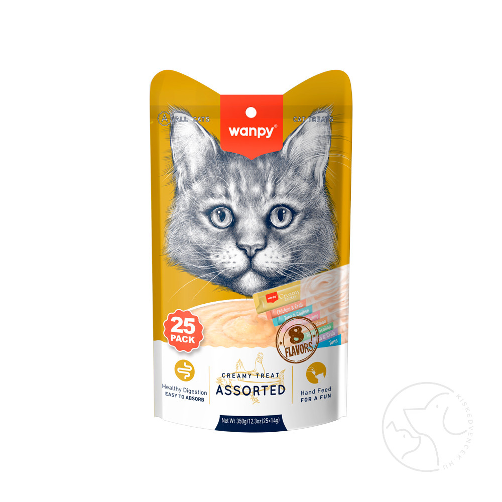 A Wanpy krémes macskajutalomfalat vegyes ízkombinációjú csomagja (350 g, 25 db) ellenállhatatlan ízek széles választékát kínálja macskájának, beleértve a lazacot, a csirkét és a tonhalat. Ezek a krémes jutalomfalatok tökéletesek jutalomfalatként vagy feltétként, hogy fokozzák macskája étkezését.