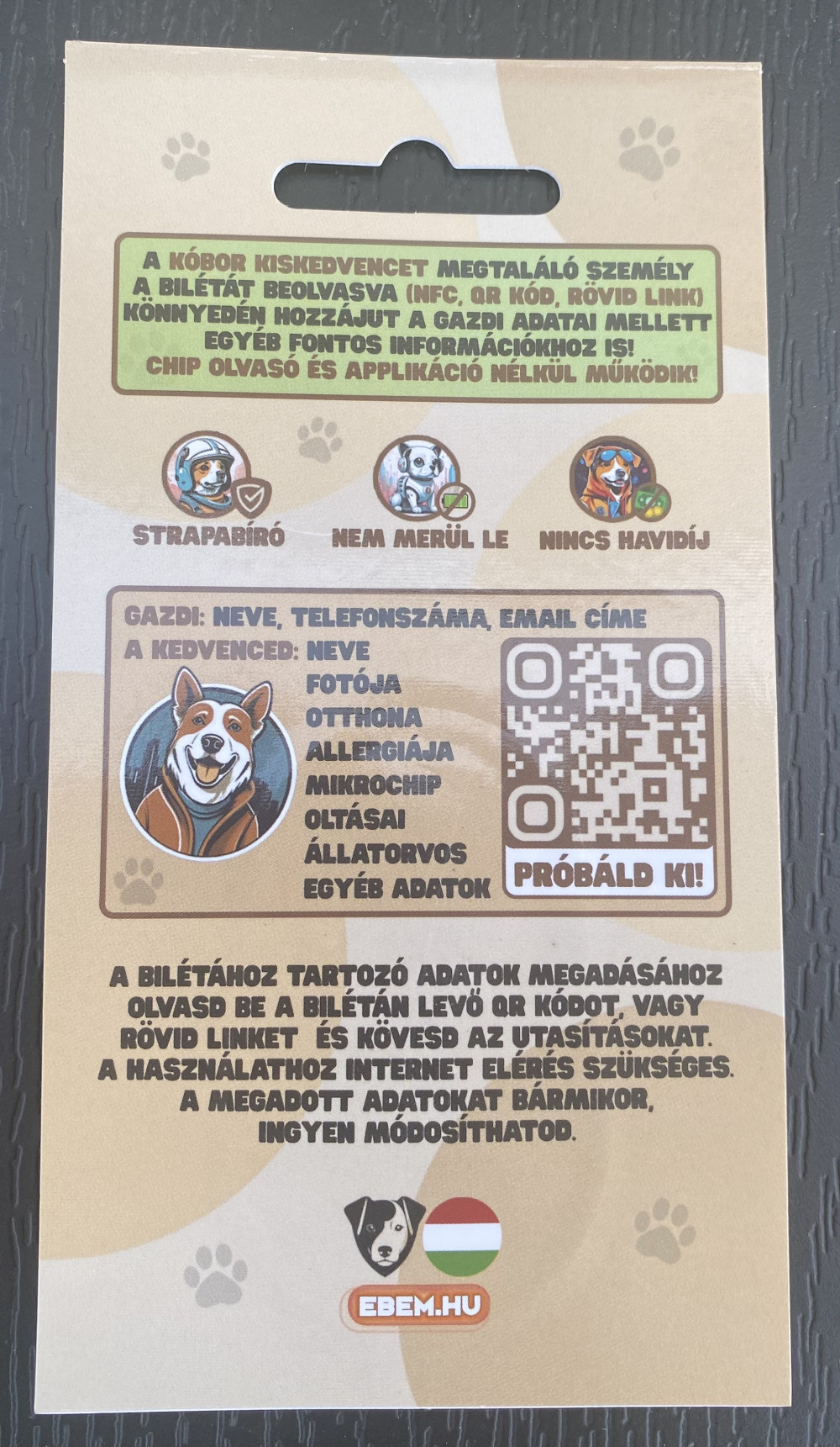 Egy okosbiléta, amely a kutyád nyakörvére erősítve, óriási segítséget nyújt abban, hogy az elkóborólt kutyád minél hamarabb, biztonságosan hazakerüljön. A leolvasáshoz elég egy okostelefon, internethozzáféréssel. A biléta tartalmaz NFC chipet, QR kódot és egy rövid hivatkozást is, melyek közül bármelyiket beolvasva, vagy megnyitva a gazdi telefonszáma mellett sok egyéb hasznos információt is megtudnak a kutyáról.